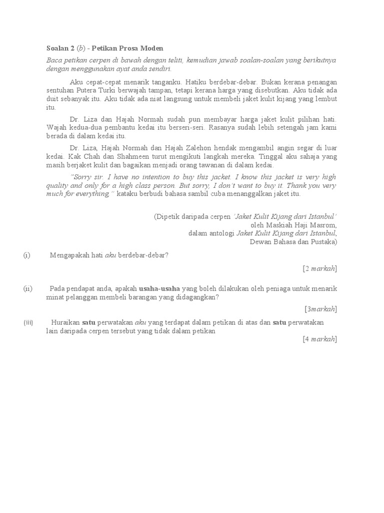Cerpen jaket kulit kijang dari istanbul (tingkatan 4) 1. Koleksi 100 soalan pemahaman antologi jaket kulit kijang via. Soalan berikut berdasarkan cerpen jaket kulit kijang;. Dalam antologi jaket kulit kijang dari istanbul,.